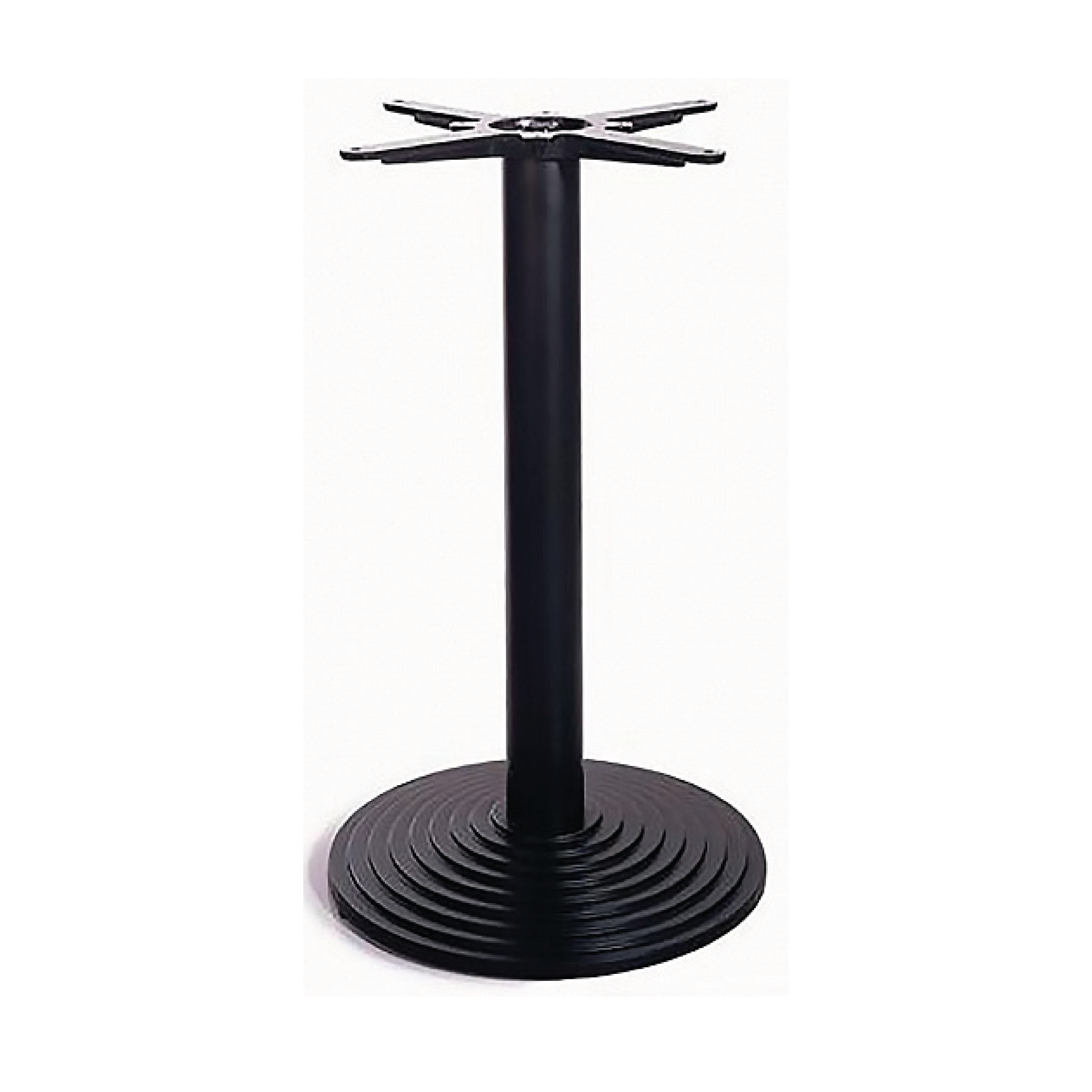 Металлическая конструкция с черным порошковым покрытием обеспечивает надежность и долговечность. Уникальное основание с концентрическими окружностями создает стильный современный образ. Рекомендуемый размер столешницы — Ø80 см или 80×80 см.