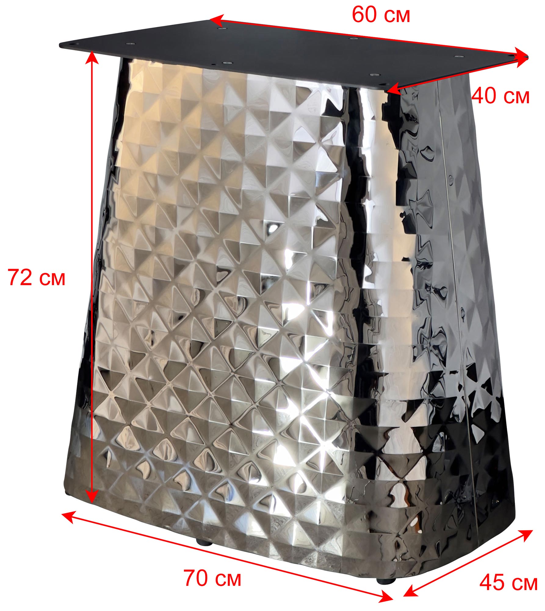 Модель выдерживает значительные нагрузки, сохраняя безупречный внешний вид. Рекомендуемый размер столешницы 1200×800 мм идеален для организации банкетных зон и рабочих поверхностей.